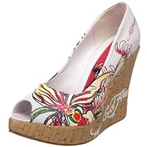 Live life in color with this exquisite peep-toe pump featuring graffiti print detailing signature logo décor and cork wedge heel. By Ed Hardy